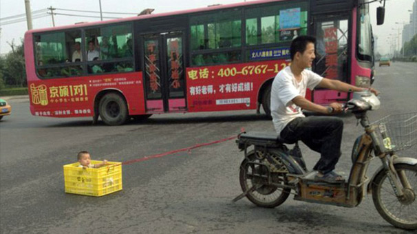 Çinli babanın, bisiklete bağlı bir kasa içerisinde bebeğini sürüklediği fotoğraf ebeveynleri kızdırdı